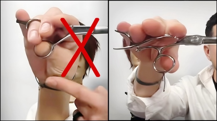 Incorrect: Inserting fingers too far forward in your shear’s finger/thumb rings bends the wrist up, creating restrictions on movement and more tension at the wrist.